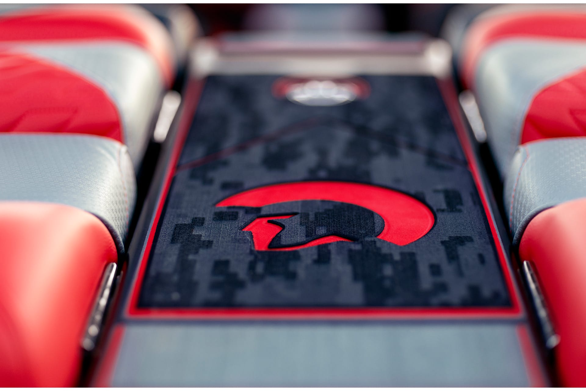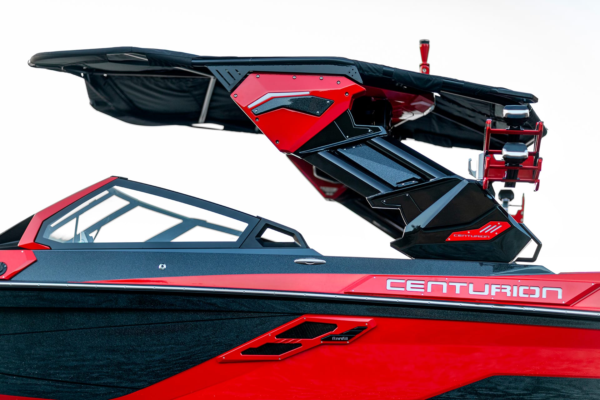 Gel Coat Scheme: Drive | Hull Main Front: Black Metal Flake | Hull Accent: Too Red | Hull Base: Charcoal | Swim Step: Too Red | Tower: Predator Power Tower | Tower Color: Black | PPT Top Color: Too Red | Tower Accent: Black Metal Flake | Colored Aluminum Accents: Too Red | Upholstery Scheme: Hex Accent with Cool Touch | Upholstery Main: Onyx Black | Upholstery Base: Too Red | Upholstery Accent: Onyx Black | Upholstery Accent 2: Charcoal | Upholstery Welt: Charcoal | Stitching Scheme: Ri Style Stitching | Stitching Accent: Red | Dash Accent: Onyx Black | Interior Side Panel: Black Metal Flake | Gator Step Flooring Scheme: 3-Color Warrior Cut w/ Laser | 1st Color Top: GS Black | 2nd Color Middle: GS Cardinal | 3rd Color Bottom: GS Shark Fin | Gator Step Laser Texture: Gator Step Laser Camo | Stereo: Centurion 12 Warriors Quad System by Wet Sounds | Speaker Color: Black