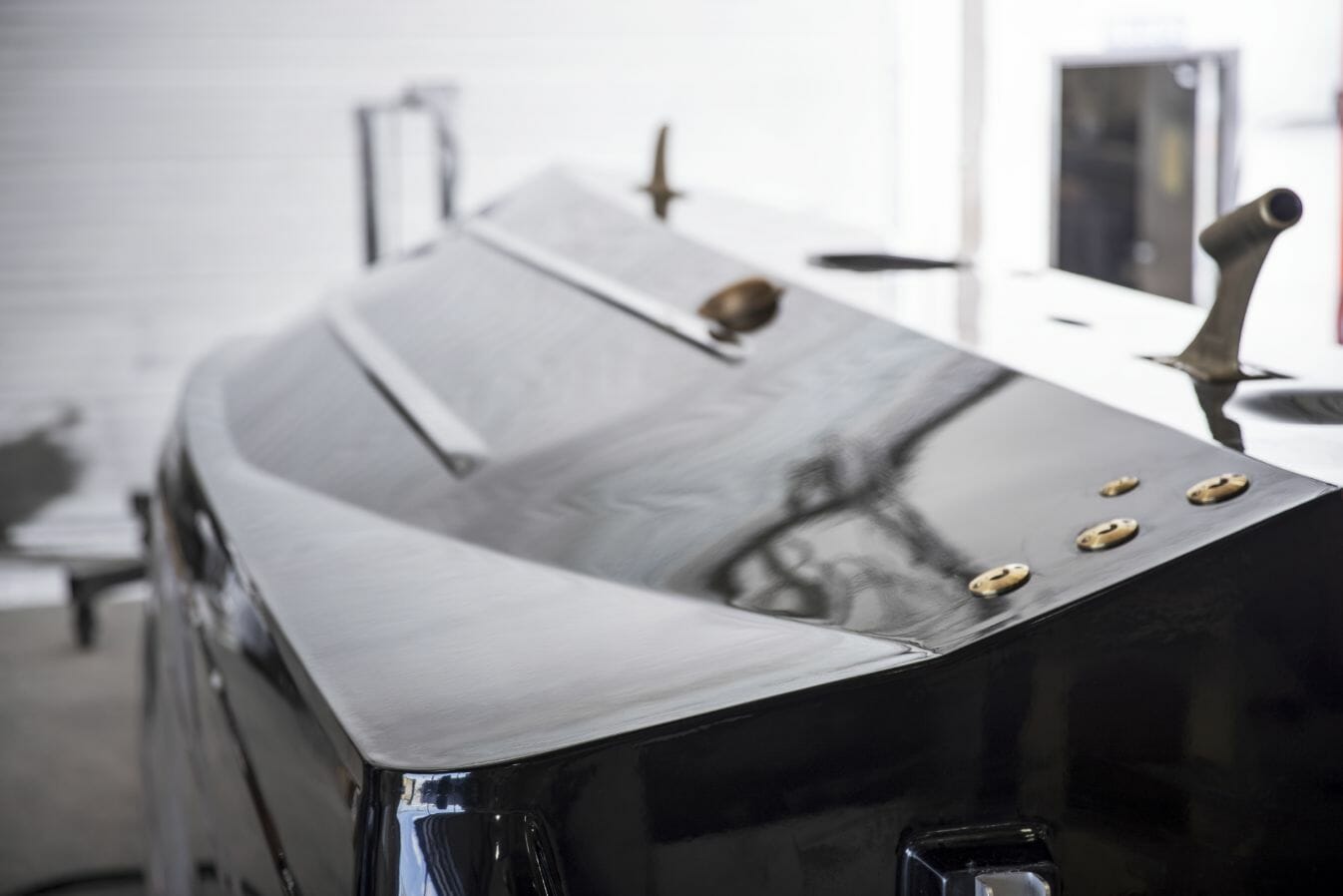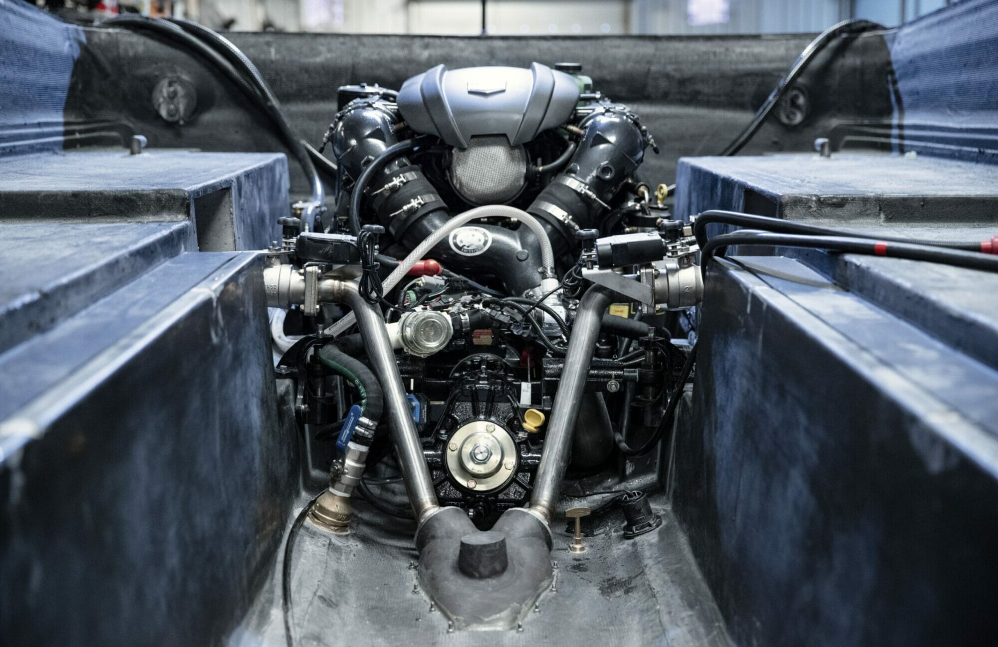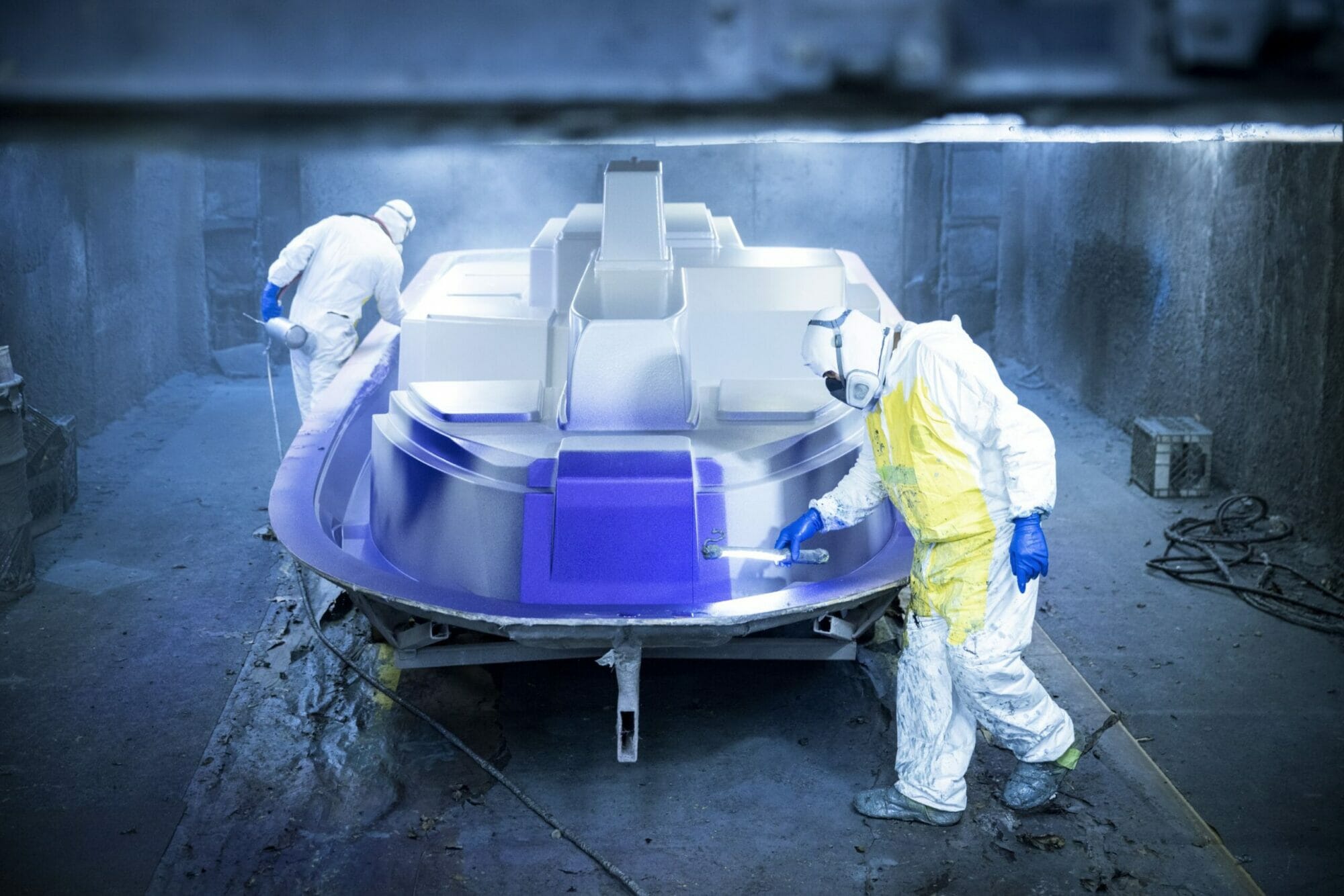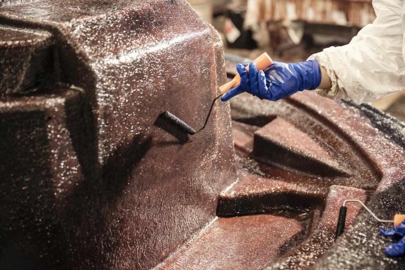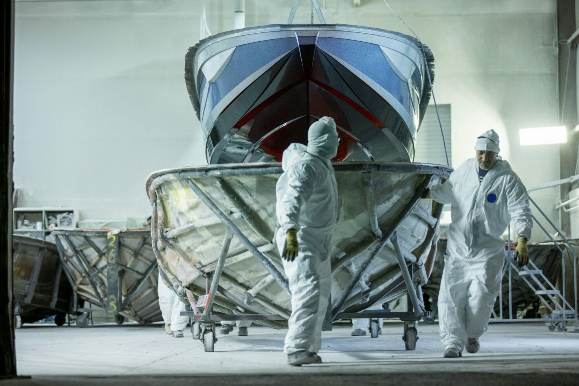 Once the custom gel coat colors are sprayed, backed by layers of engineered fiberglass cloth, and strengthened with the stringer system, your Centurion is pulled from its mold, revealing your custom design. Our craftspeople then progress the build to a finished product that meets your specifications. The hull is flipped over for access to the Opti-V running surface so the laser-aligned underwater gear, like the rudder, prop shaft, and the tracking fin or the available Centurion Articulating Tracking System (CATS) can be installed. Next the pumped ballast pick-up through-holes and the optional RAMFILL2 scoop is installed.